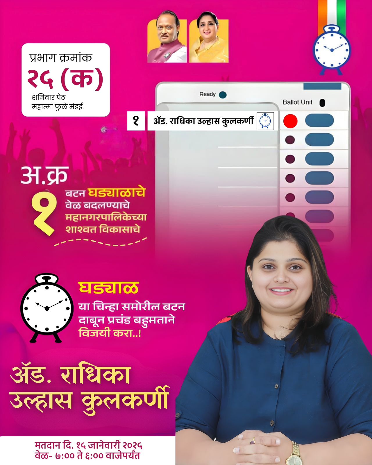 पिंपरी–चिंचवड :- महानगरपालिका निवडणुकीच्या पार्श्वभूमीवर प्रभाग क्रमांक २५ (क) – सर्वसाधारण ओपन महिला वॉर्ड मधून अॅड. राधिका उल्लास कुलकर्णी या राष्ट्रवादी काँग्रेस (अजित पवार गट) कडून निवडणुकीच्या रिंगणात उतरल्या असून, त्यांच्या उमेदवारीमुळे प्रभागातील राजकारण चांगलेच तापले आहे. सुशिक्षित, अभ्यासू आणि सर्वसामान्यांशी थेट संपर्क असलेले नेतृत्व म्हणून राधिका कुलकर्णी यांची ओळख असून, नागरिकांकडून त्यांना उत्स्फूर्त प्रतिसाद मिळत आहे.